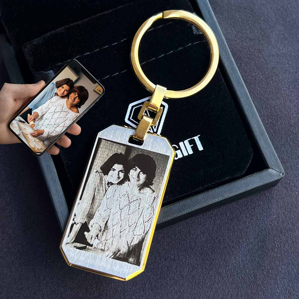 -Keychain with a custom photo engraving and a custom text engraving on the other side.